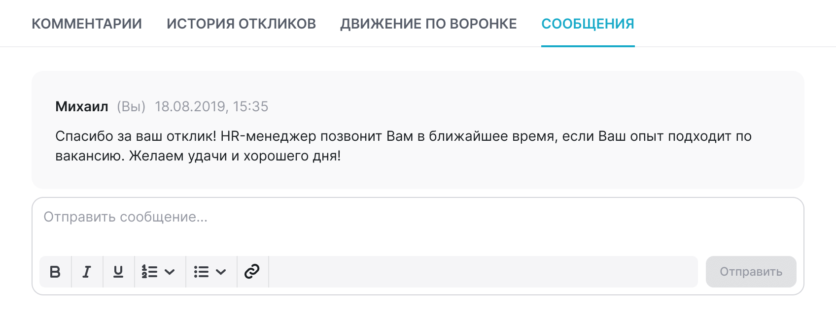 - Отправить произвольное сообщение кандидату;